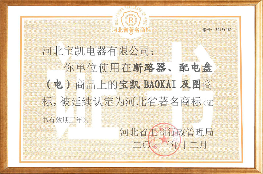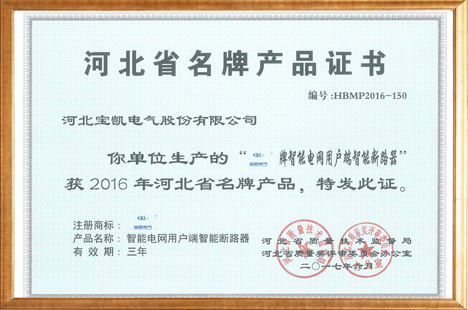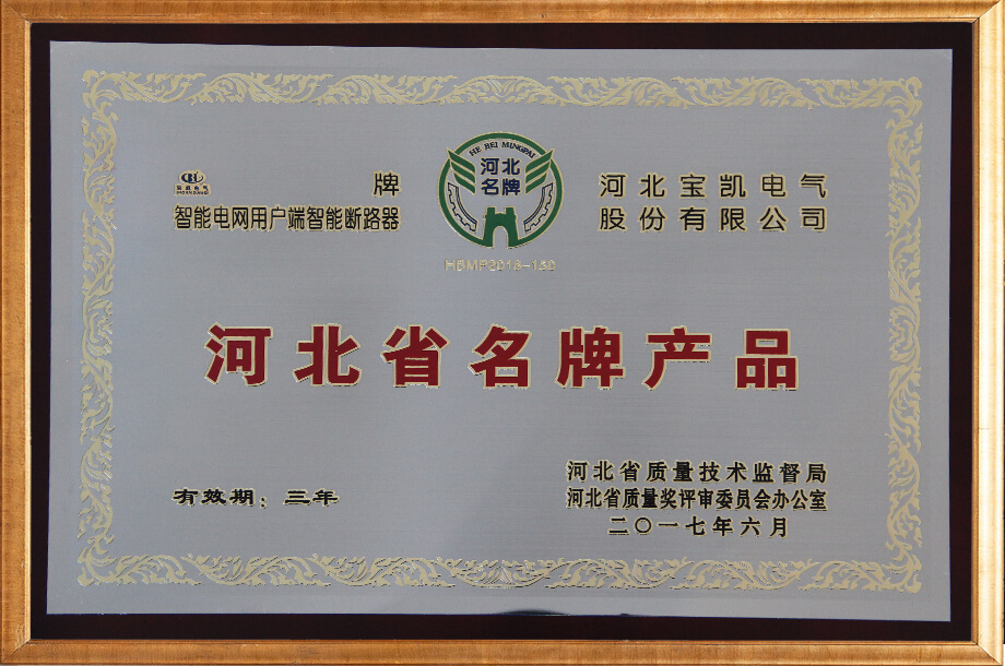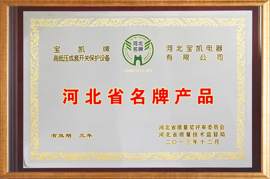 河北省名牌产品证书