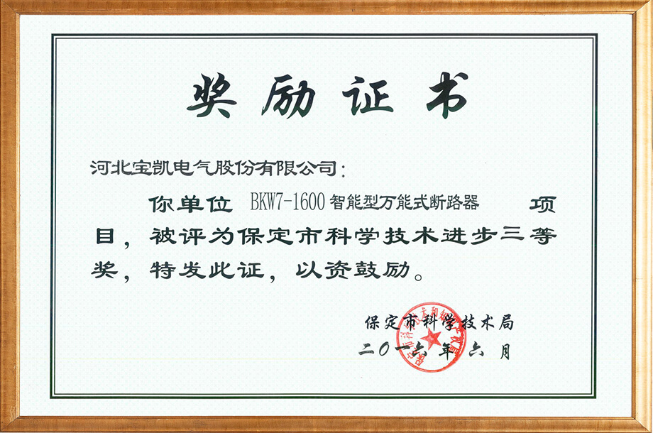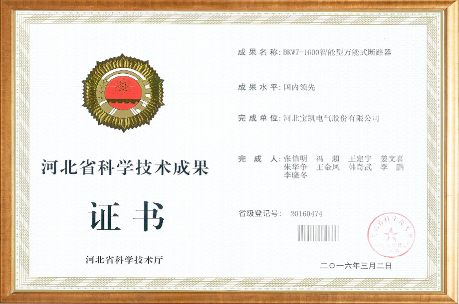 电力物联网用智能小型断路器-科技成果证书