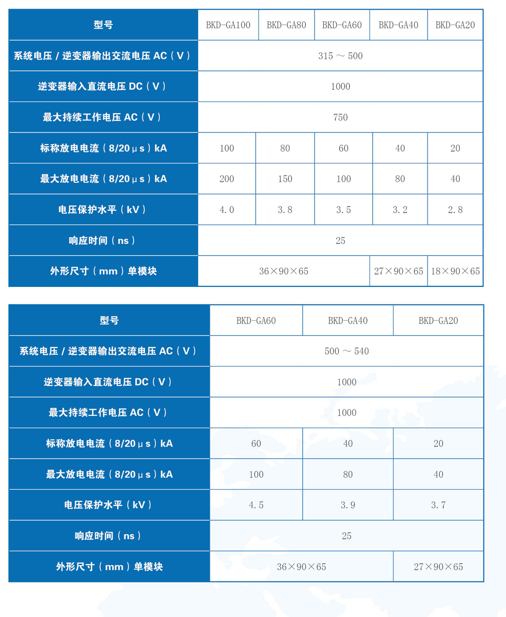 BKD系列新能源专用电涌保护器均采用了非线性特性极好的过电压保护元件。在正常情况下,电涌保护器处于高阻状态,泄漏漏电流极低。当系统出现电涌过电压时,电涌保护器立即在纳秒级内导通,将过电压的幅值限制在设备的安全工作范围内,同时将电涌能量导入大地释放掉;随后电涌保护器又迅速变为高阻状态,从而不影响风电、光伏系统的正常工作。产品符合GB/T 18802.11、GB/T 18802.11标准。